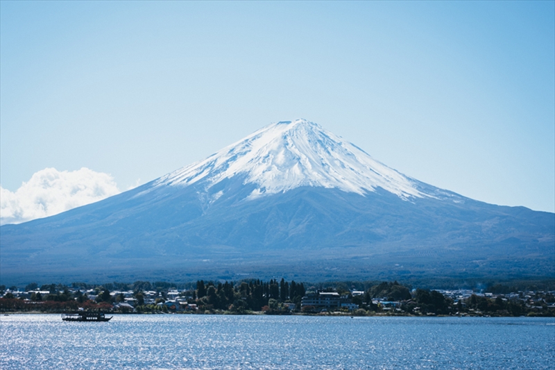雄大な富士の麓、富士の懐に抱かれた木々、湖畔の美しい情景